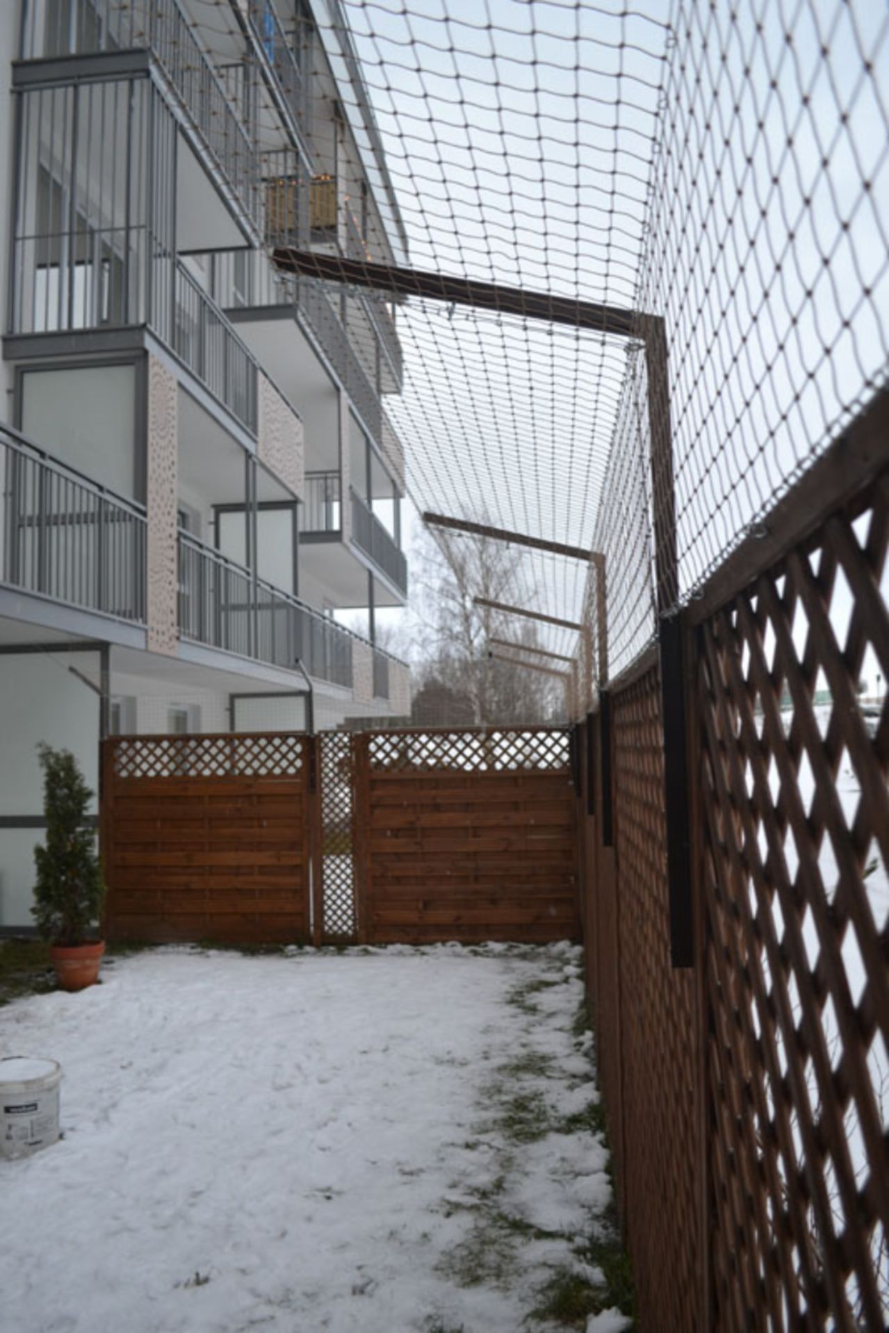dopinanie siatki polietylenowej - dedykowanej dla kotów (oko 4 x 4 cm, wzmocniony splot, kolor piaskowy lub czarny), za pomocą ocynkowanych zszywek