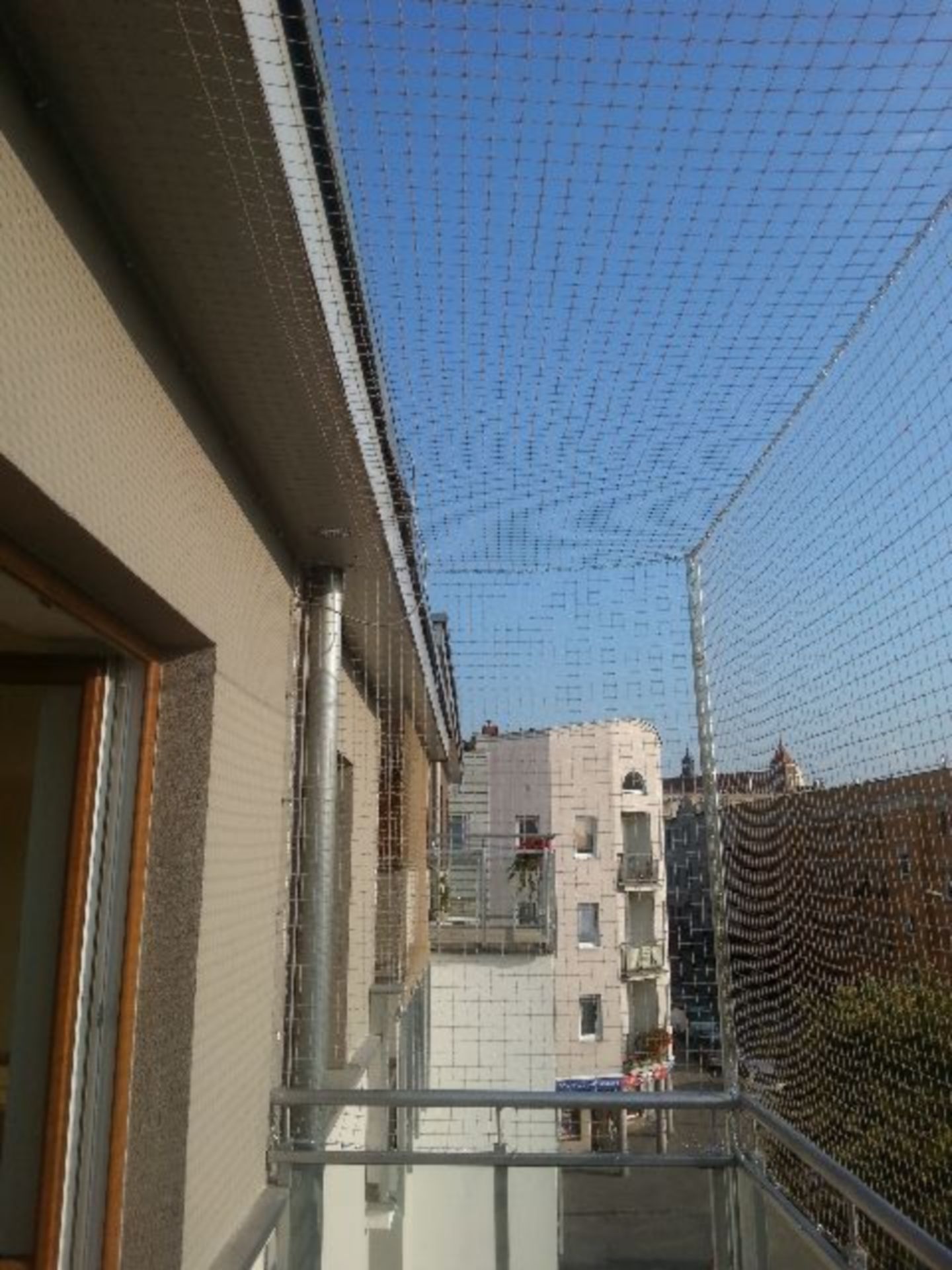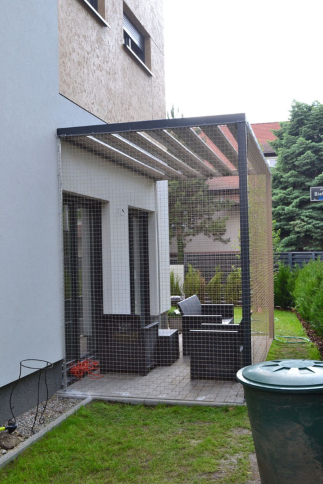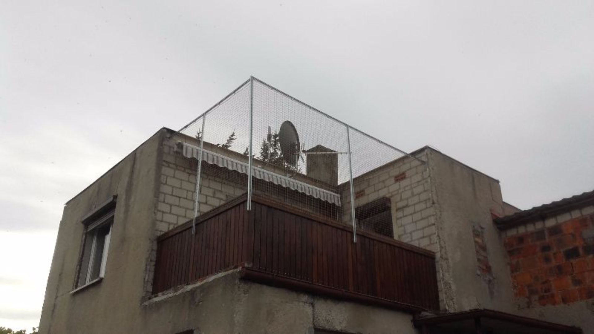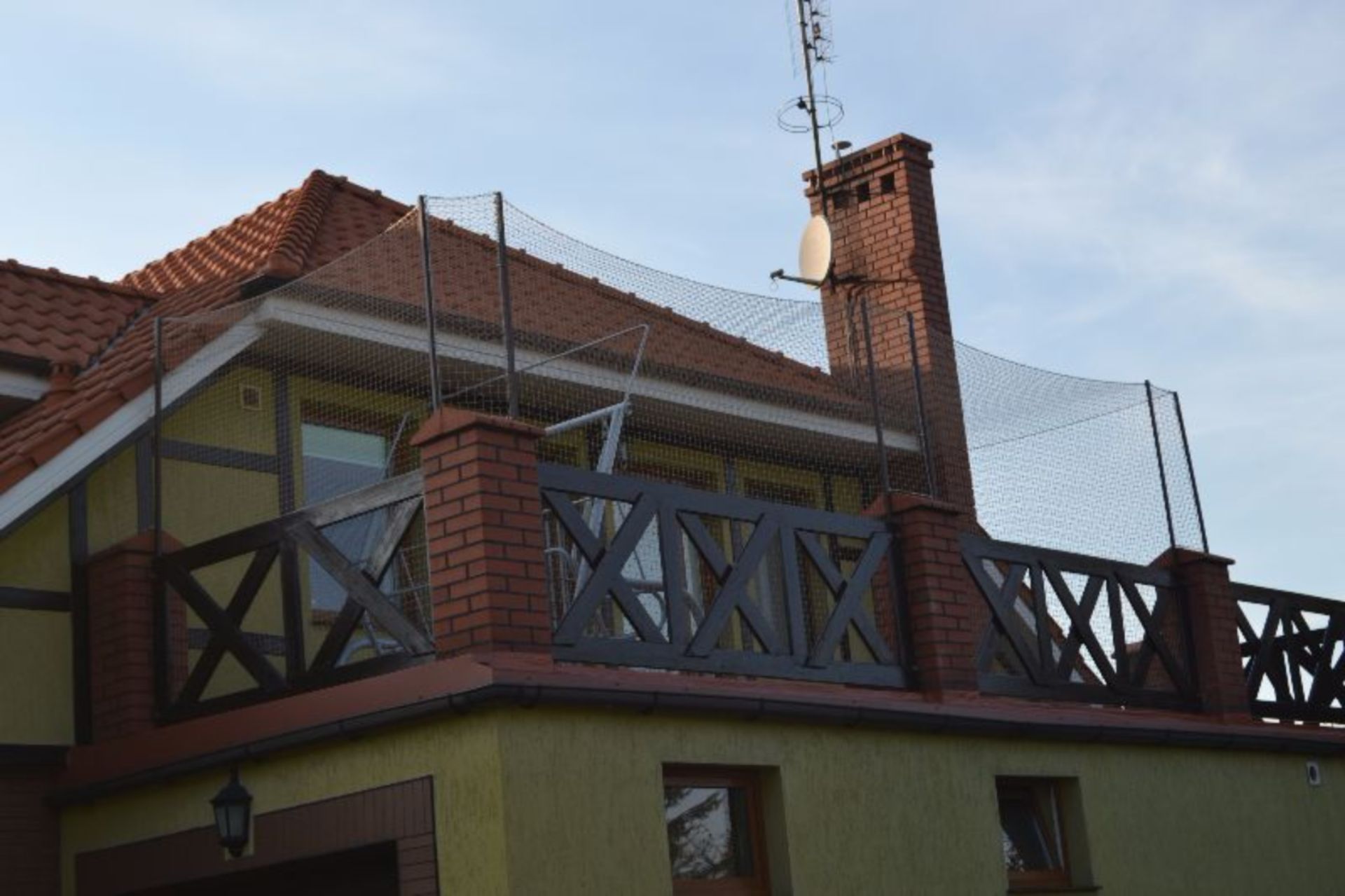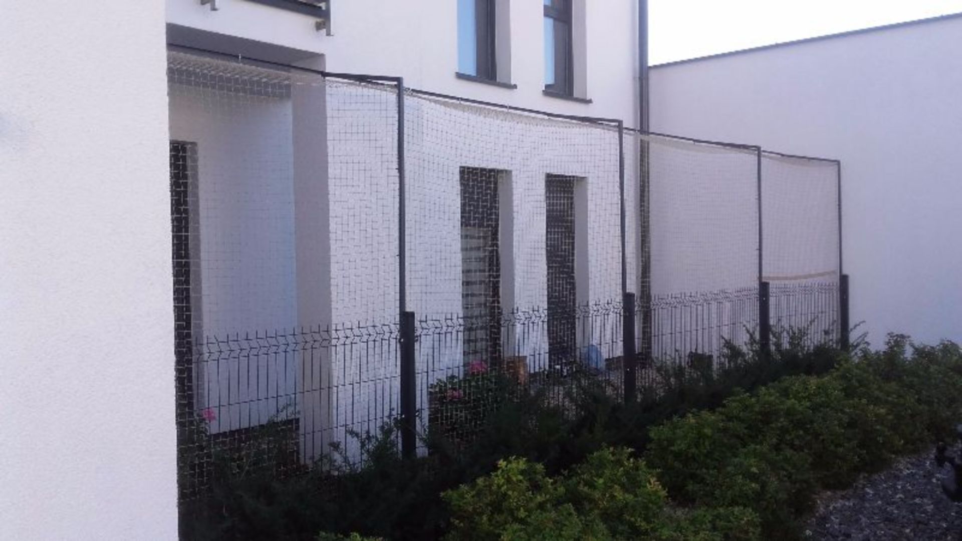 montujemy siatki na stelażach o wysokości około 3 m. Stelaże są zakończone odcinkiem o nachyleniu uniemożliwiającym ucieczkę wspinających się kotów (podobne do wybiegów dla dzikich zwierząt).