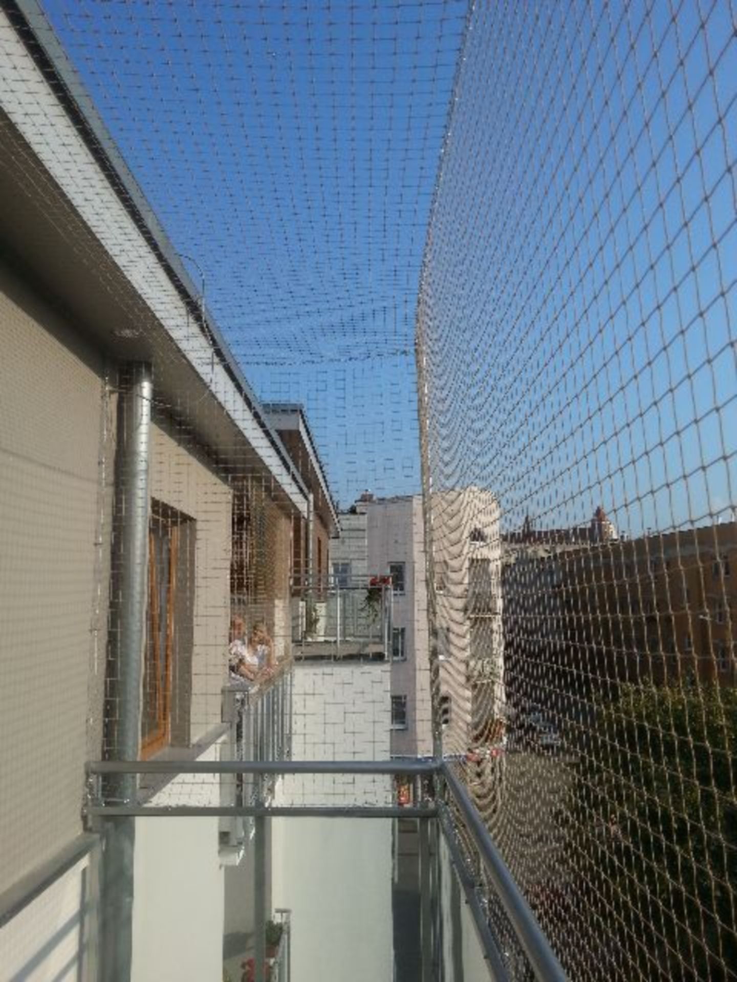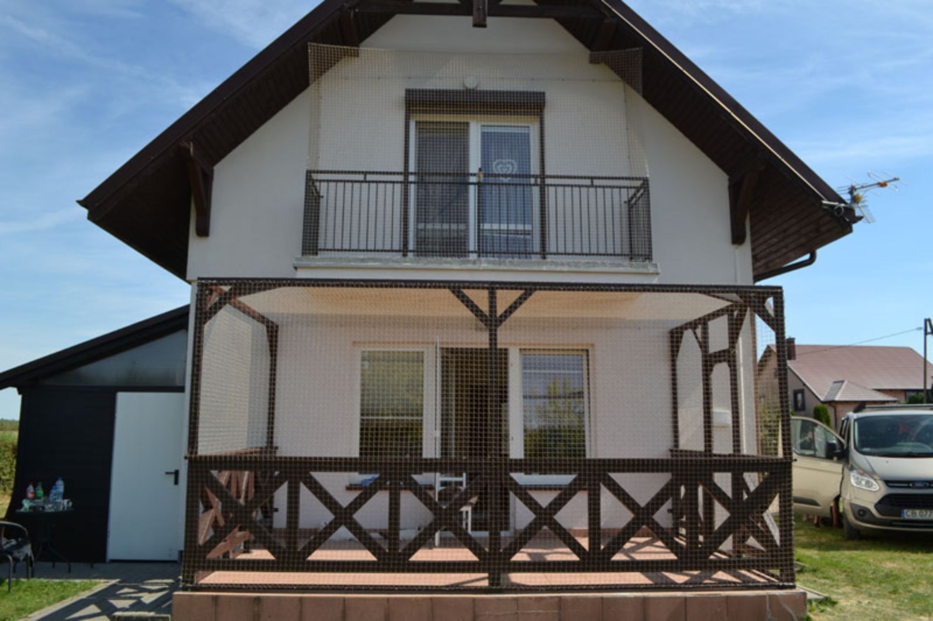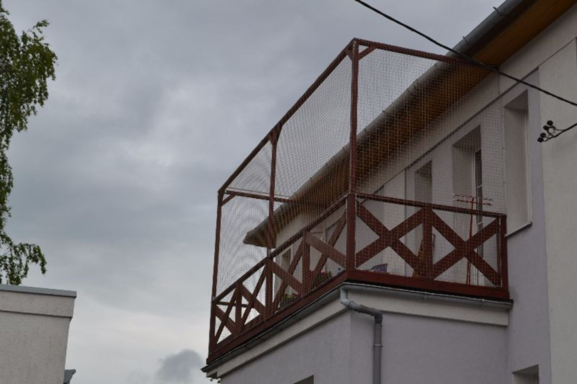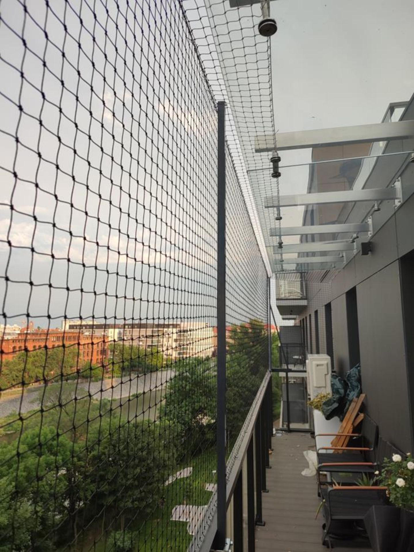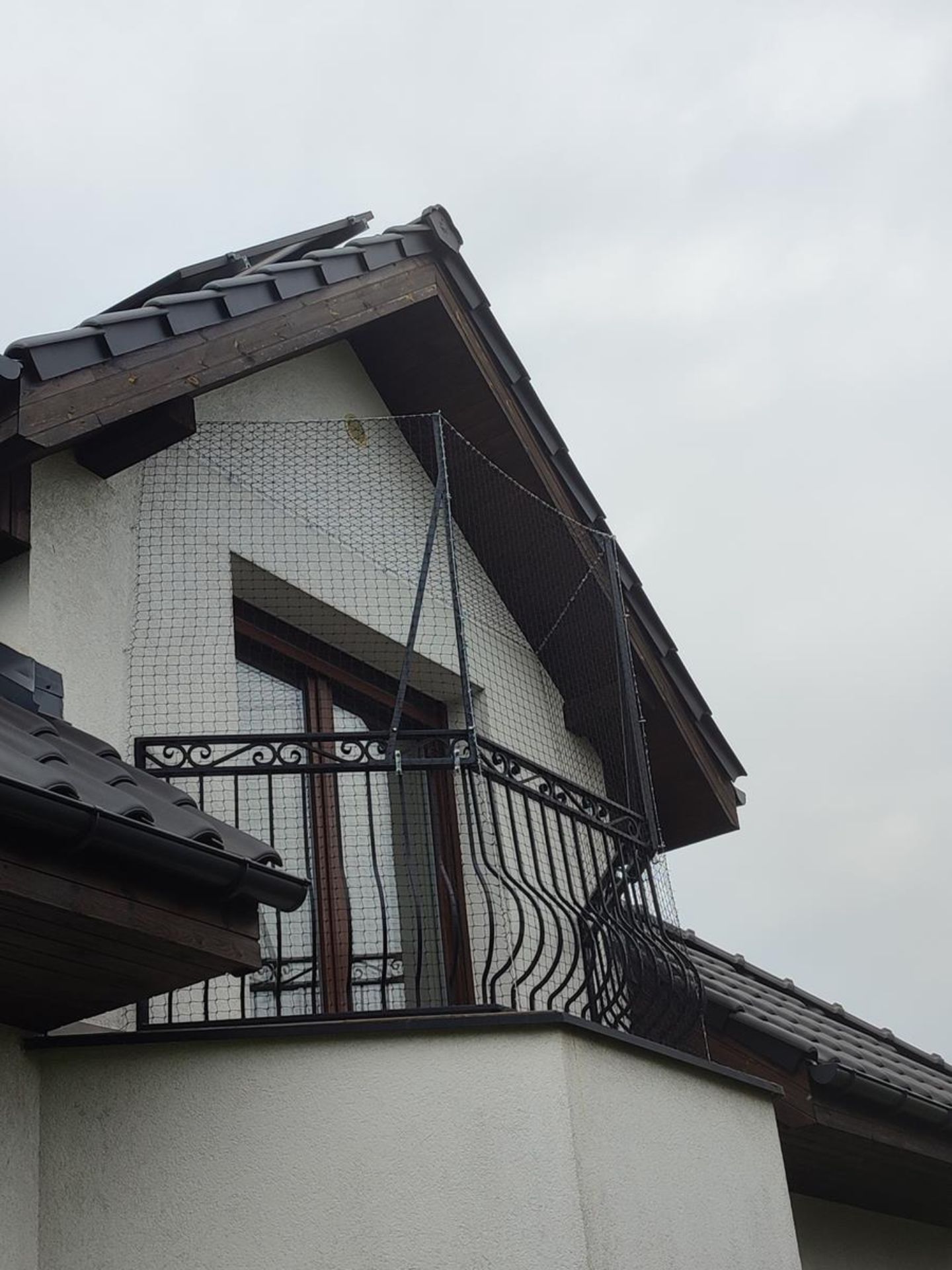 montujemy siatki na stelażach o wysokości około 3 m. Stelaże są zakończone odcinkiem o nachyleniu uniemożliwiającym ucieczkę wspinających się kotów (podobne do wybiegów dla dzikich zwierząt).