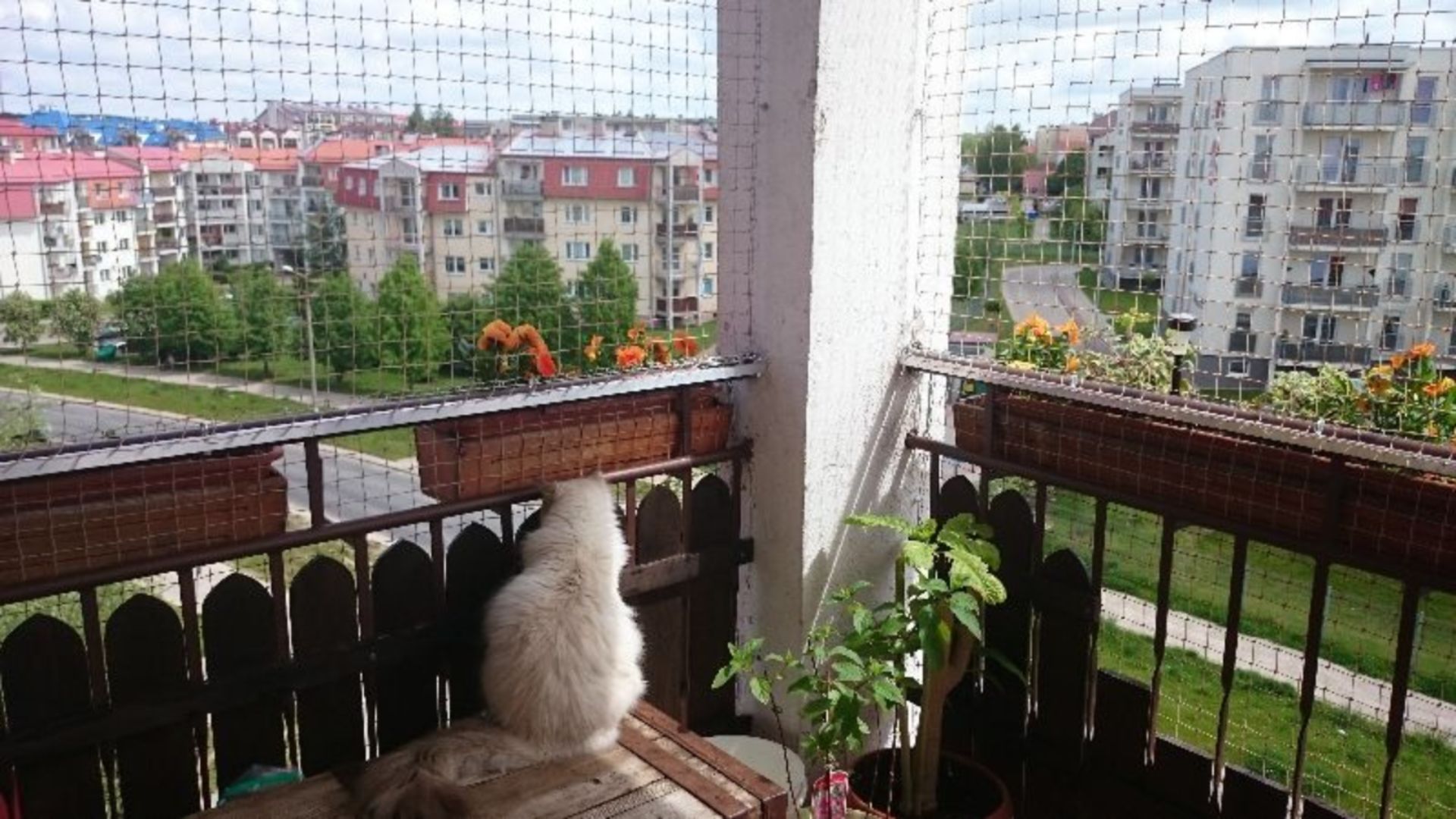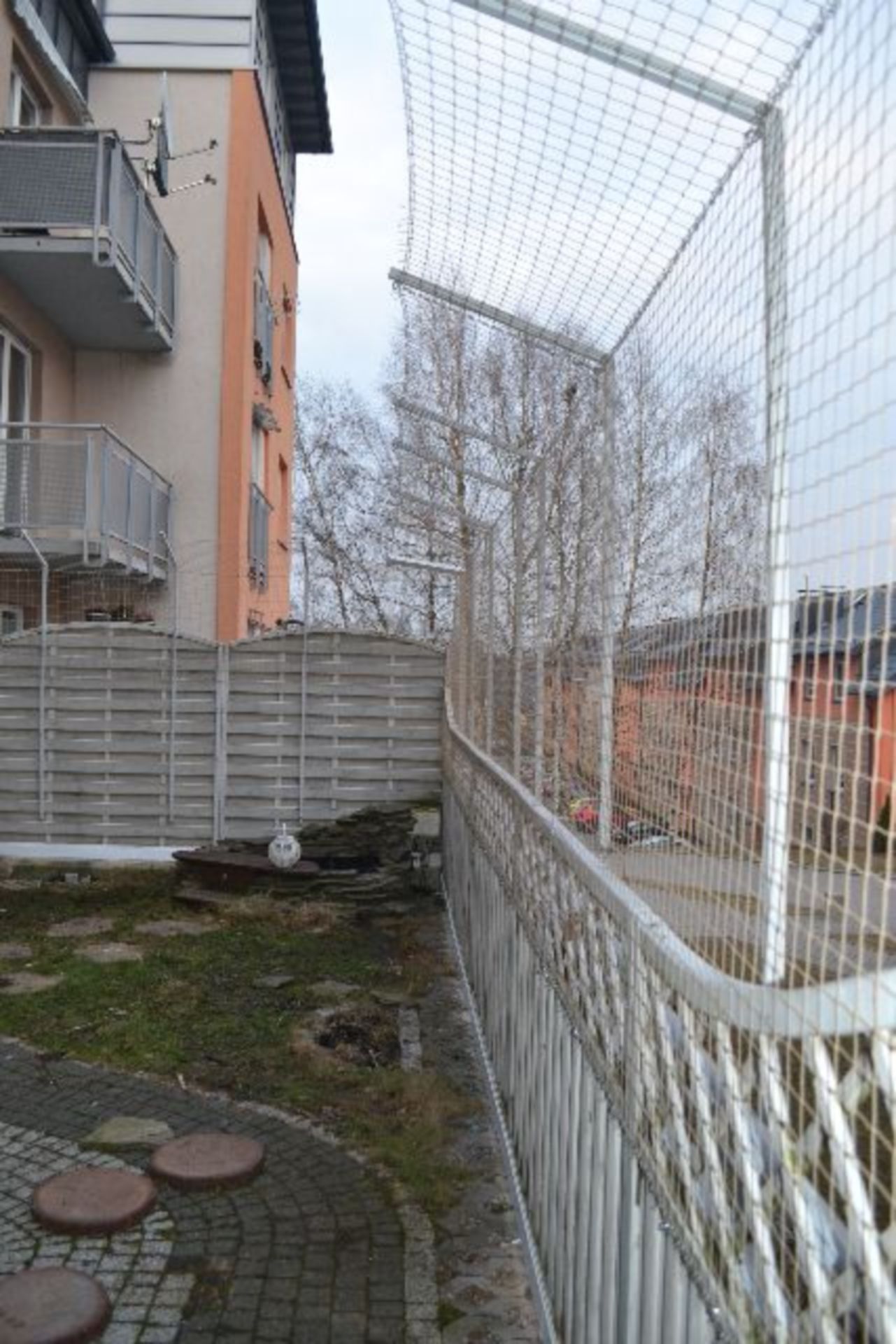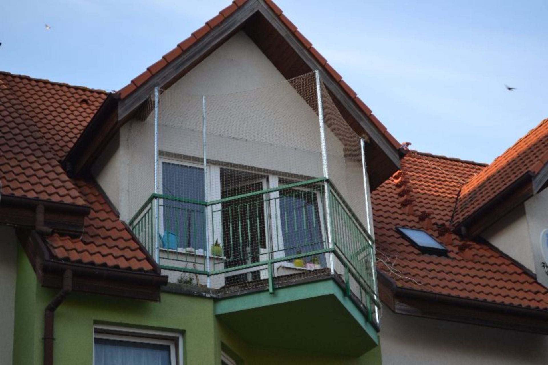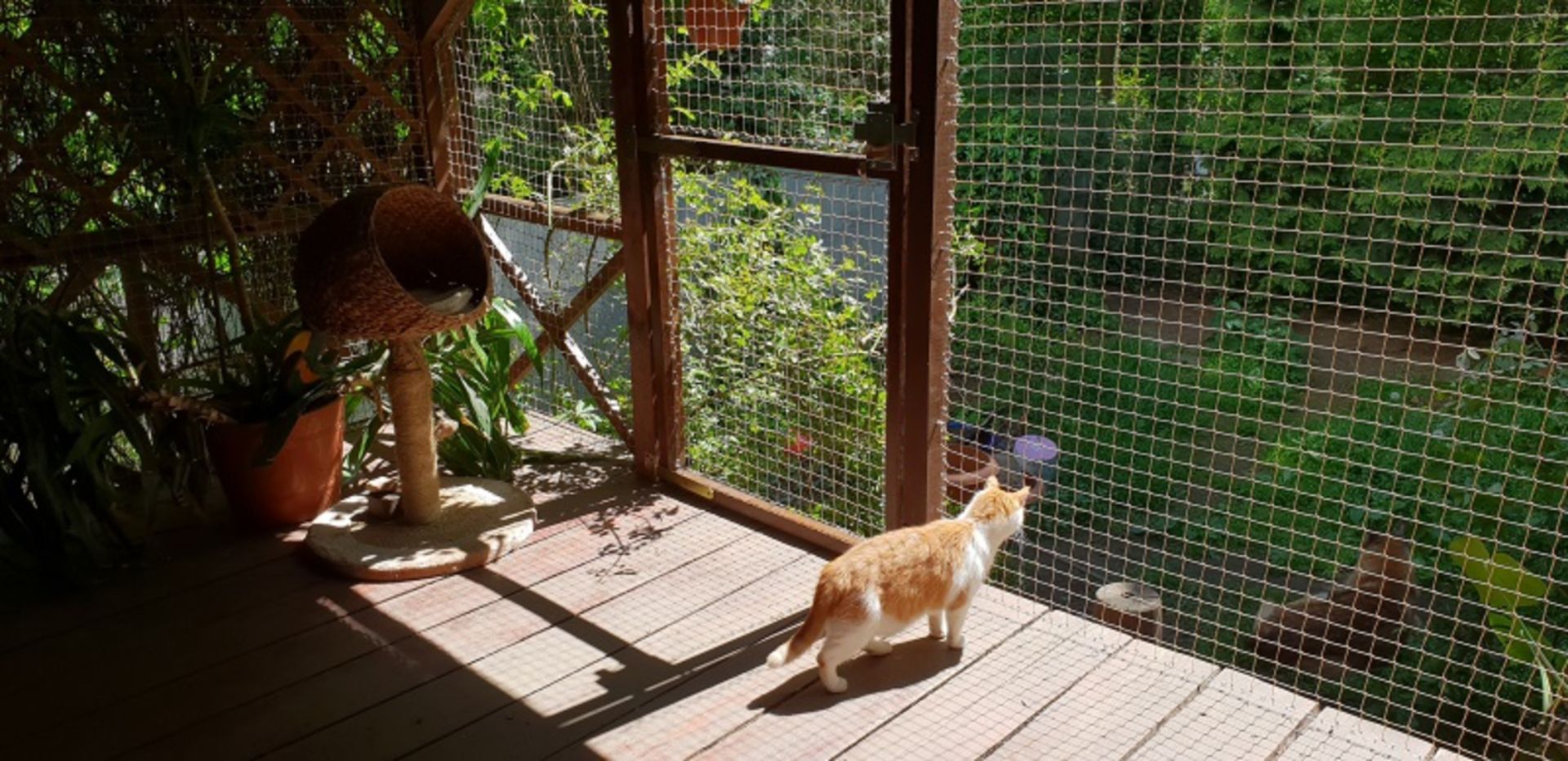 montujemy siatki na stelażach o wysokości około 3 m. Stelaże są zakończone odcinkiem o nachyleniu uniemożliwiającym ucieczkę wspinających się kotów (podobne do wybiegów dla dzikich zwierząt).